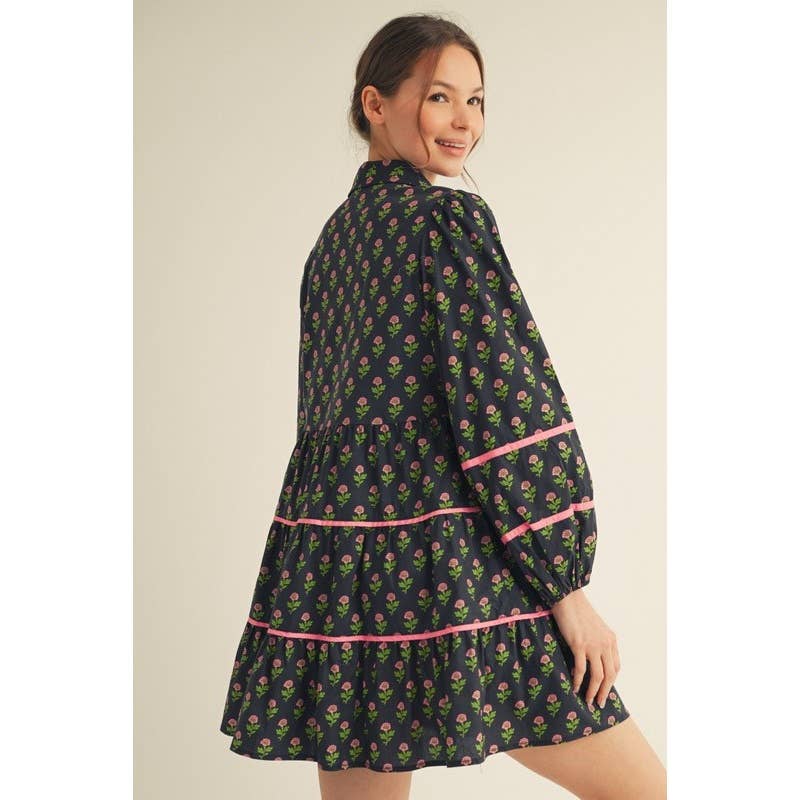 Button Down Tiered Floral Dress - Long sleeves button down floral dress with contrast trim accent, tiered dress, collared neckline. - Model is 5'10'' and is wearing a Small. - 100% COTTON