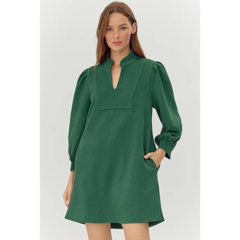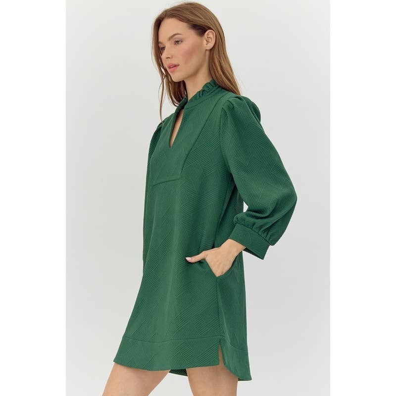 Textured dress with frilled split neck, side pockets, three quarter puffed sleeves, band cuffs, and vented hemline. - Non-sheer, lightweight. - Model is 5'10'' and is wearing a Small. - 97% POLYESTER 3%SPANDEX