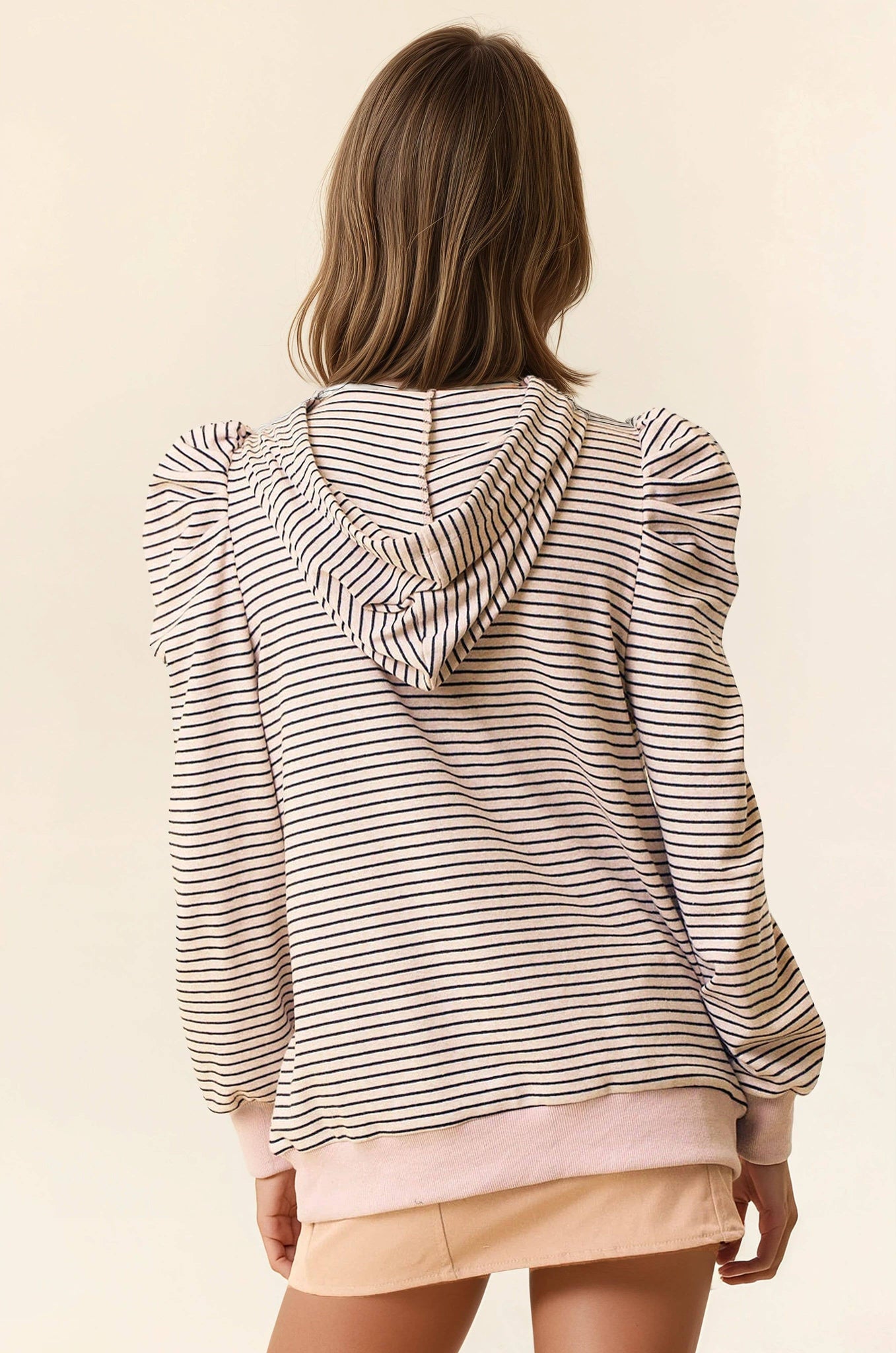 Distinctive puff sleeve design with dramatic shoulder volume - Horizontal stripe pattern throughout - Comfortable drawstring hood with matching cords - Ribbed cuffs and hem for a secure fit .