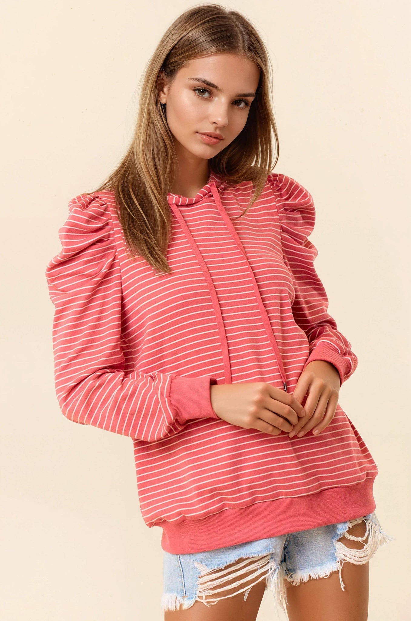 Distinctive puff sleeve design with dramatic shoulder volume - Horizontal stripe pattern throughout - Comfortable drawstring hood with matching cords - Ribbed cuffs and hem for a secure fit.