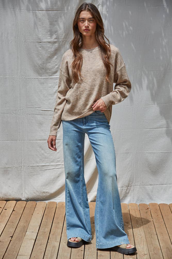 Knit Sweater Acrylic Polyester Wool Crew Neck Long Sleeve Pullover Top With Contrast Stitches Detail