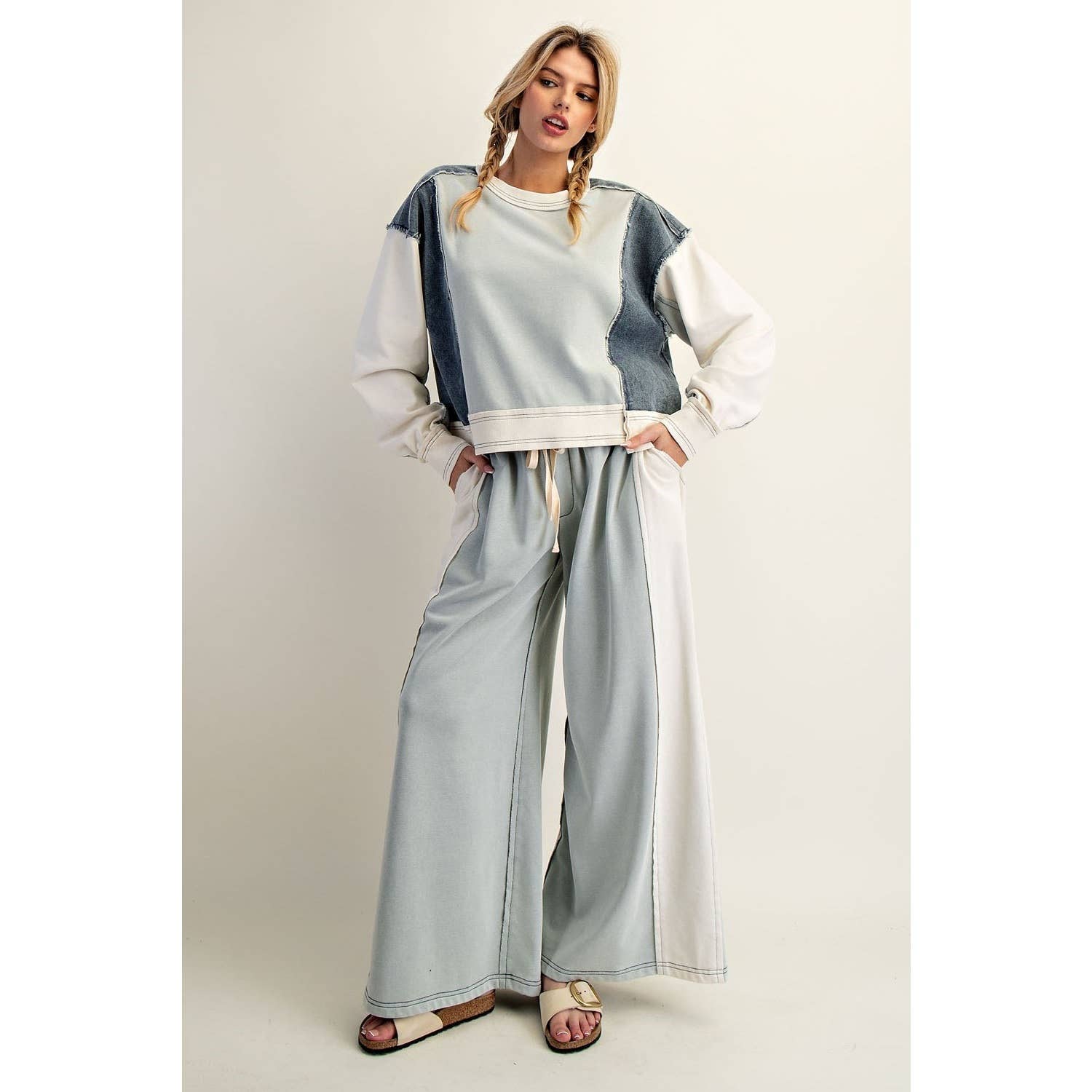 Frayed Color Block Long Sleeve Pullover - This color block pullover showcases a rounded neckline, a relaxed silhouette with raw edged denim patchwork at the shoulders and sides, contrast panel sleeves, wide ribbed trim at the hem and cuffs, and frayed seams throughout for a modern, deconstructed look.