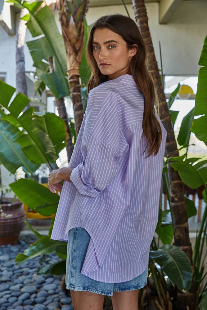 This classic and versatile, woven cotton polyester button-down shirt is perfect for everyday wear. The collared neckline, button-down front, and long sleeves create a timeless and professional look. The horizontal striped pattern adds a touch of interest and style. The relaxed fit and slightly oversized silhouette offer a comfortable and modern feel.