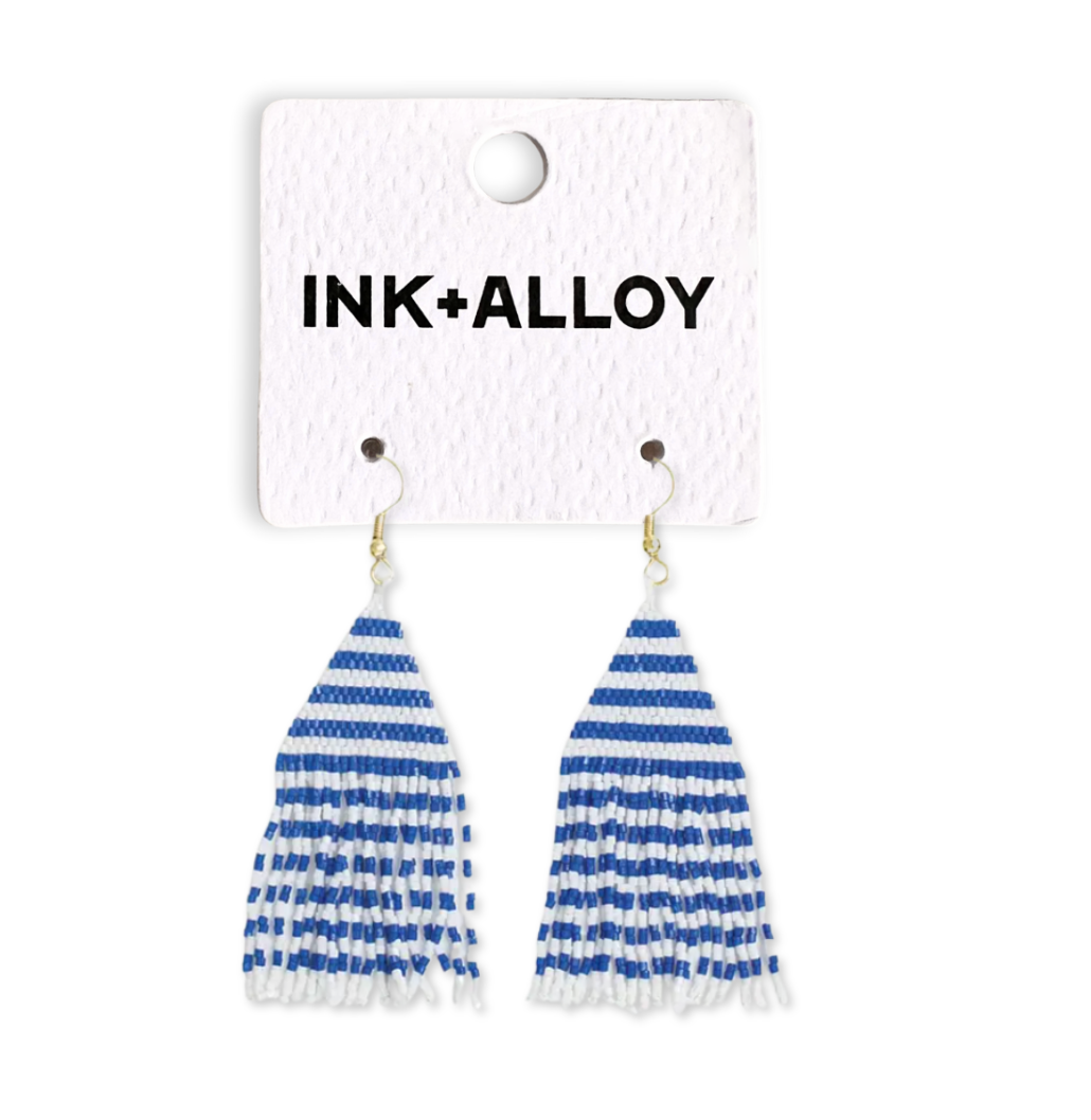 Bring bold team spirit and bohemian flair to your game day look with the Lexie Horizontal Stripes Beaded Fringe Earrings. These statement earrings feature rows of royal blue and crisp white seed beads in an eye-catching striped pattern. Layers of beaded fringe dangle below, swaying gracefully with every movement as you cheer on your team to victory.